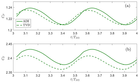 Thrust and power coefficients are functions of the upstream conditions through the Froude number used in calculation; therefore, and are modulated by the tidal cycle. Thrust and power coefficients time series were obtained from both models using a fence configuration constituted by turbines with a relatively large blockage ratio (). The time series from an tidal cycle and taken from the middle of the channel, where the array was deployed, are shown in Figure 3a,b. and time series present two maximum values that correspond to maximum flood tide and maximum ebb tide velocities. Comparison between the solutions obtained from the models indicate that ADI produces slightly higher magnitudes of () and () than TVD’s and . Time-average of and obtained from ADI and TVD are consistent with LMADT-OCH analytical model and they indicate upper limits for these coefficients.