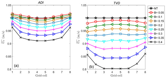 Contrary to a tidal fence configuration, where energy extraction produce uniform conditions along the array and a middle-fence cell capture this dynamic, the implementation of a partial fence produces a scenario where energy extraction occurs along a limited section of the cross-channel, indicating the existence of array-bypass flows. To identify the effects of a partial fence on the upstream velocities, the time-averaged stream-wise component of velocity was calculated at each grid cell that constitutes the partial fence. Upstream velocities normalised by natural state velocities and obtained for increasing values of blockage ratio computed with ADI and TVD are presented in Figure 4. Upstream velocities along the fence tend to be uniform for small blockage ratios (), but further increase of B influence differently the grid-cells located at the middle and at the edges of the partial fence. Large values of B produce higher velocity decreases in the middle of the array, meanwhile the edges exhibit smaller velocity reduction. A comparison of results obtained from both models shows that upstream velocities from ADI present smaller reductions with increasing B than TVD. In addition, for small B, velocities at the edges of the partial fence simulated with ADI show a slight magnitude enhance. This suggests that the faster array-bypass flow computed with ADI model is influencing the velocities at the partial-fence edges. The smaller velocity reduction presented in ADI’s velocity solutions is consistent with [45]. They indicated that a gradual varying flow scheme under-estimate the velocity decrease produced by momentum extraction; meanwhile, a rapidly varying flow scheme approximates more accurately this reduction due to its capacity to solve the velocity spatial gradients generated during energy extraction.