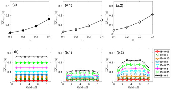 Estimation of turbine efficiency required calculation of head drop across the array. was calculated using an analytical and numerical approach. Analytical solutions were obtained by solving a cubic polynomial, which represents a condition on the head drop across the array obtained from LMADT-OCH [8]. Coefficients of the polynomial are a function of blockage ratio, thrust coefficient, and Froude number. and were obtained from TVD simulations, as this scheme approximates the velocity reduction more accurately for a fence scenario [45]. Meanwhile, numerical solutions correspond to head drops obtained from depth differences across the array at upstream and downstream locations. These locations correspond to the neighbouring upstream and downstream cell. In the case of a 16 m diameter device, the mean axial upstream velocities are recovered to about 80% [46,47] within 160 m; therefore, the grid size used in this research ( = 150 m) is of the order of the turbine wake length suggesting that the neighbouring cell approximates the upstream conditions of the flow. Maximum head drops within a tidal cycle were calculated for increasing B, obtained analytically and numerically using a fence (Figure 5a) and a partial fence (Figure 5b) were compared. For bounded-flows, analytical and numerical solutions are similar; however, a GVF scheme (Figure 5a.1) produces a solution more consistent with the analytical solution (Figure 5a). In the case of unbounded flows, the analytical solution of LMAD-OCH indicates a homogeneous water drop along the partial fence for given blockage ratio (Figure 5b). This solution is consistent with the 1D assumption of the theoretical model [9,43]. Conversely, numerical solutions indicate non-uniform head drops along the array for increasing B values. Within the partial fence, maximum values of head drop are found in the middle cells, while smaller depth change are exhibited towards the edge of the array. Comparison of obtained from TVD and ADI models for a partial fence indicate that TVD simulates larger head drops (Figure 5b.2). Additionally, for small B, at the middle-cells of the array obtained from TVD are similar to analytical solutions; however, for , the head drop magnitudes become smaller than the analytical solution. These results indicate that rapidly varying flow solver provides a reasonable insight into the effect of small blockage ratios on the head drop across the partial fence, where is influenced by the bypass flow producing a head drop reduction at the edges of the partial fence.