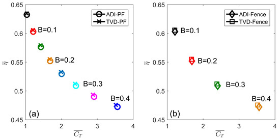 Turbine efficiencies were estimated for increasing blockage ratios. Analytical and numerical solutions of for flows characterised by small Froude numbers were calculated, as the solutions were found to be consistent only numerical solutions are reported. These solutions are functions of the head drops obtained with ADI and TVD. Time-averaged and array-averaged turbine efficiencies calculated for both configurations: fence and partial fence are presented in Figure 6a,b, respectively. Turbine efficiencies were plotted against the time-averaged, array-averaged thrust coefficients. Increasing B values indicate a gradual efficiency reduction but thrust coefficient augmentation. Maximum turbine efficiency found () correspond to the smaller blockage ratio tested ( 0.05) and this value is associated to 1.0; meanwhile, blockage ratio increases to 0.4 produce a turbine-efficiency reduction () and thrust coefficient increase ( 3.5). Efficiency decrease with B augmentation is explained by the larger energy dissipated due to turbine-wake mixing [48]. On the other hand, the analytical study of further blockage ratio increase () indicates a slow turbine-efficiency decrease rate [14]. This trend indicates that for a very large B, subsequent dimension augmentation produces a small efficiency reduction; such a scenario is attractive; however, large blockage ratios are not a practical option.