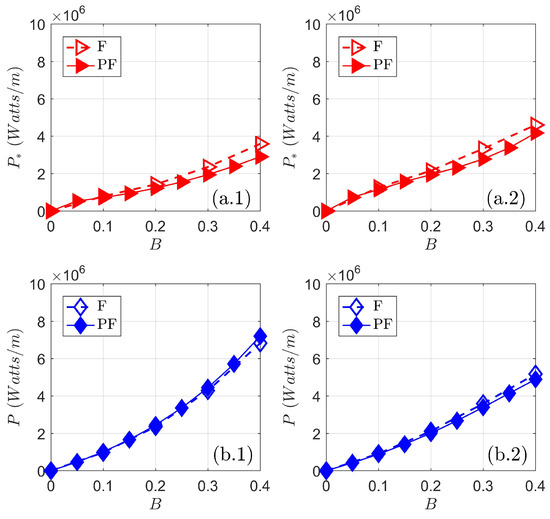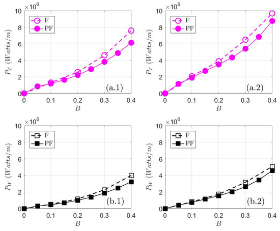 To compare the performance of a partial fence with a fence, time-averaged and array-averaged power metrics were obtained from both configurations. Total power extracted estimated with ADI and TVD are presented in Figure 7(a.1,a.2), respectively. is a function of water drop and the increase of blockage ratio produces a head drop augmentation which is responsible of larger values of total power extracted. For bounded flows (F), [45] indicated that is accurately approximated by an ADI model because a GVF solver approximates better the head drops across a fence. For unbounded flows scenario (PF), magnitudes obtained from ADI and TVD are smaller than the fence. This result is explained by the head drop reported by the models for the partial fence; smaller magnitudes were obtained for this configuration due to the reduced head drops at the edges of the array. The comparison of obtained by the models for the partial fence indicate that TVD scheme produces larger magnitudes of total power extracted. These solutions are more reliable as TVD approximates better the head drop across a partial fence. The power dissipated by turbine-wake mixing estimated with both ADI and TVD models are shown in Figure 7(b.1,b.2), respectively. depends on the turbine efficiency and the total power extracted, which in turn is strongly influenced by the head drop across the turbine array. This dependency indicates that solutions are also explained by head drop values. For bounded flows, values obtained with ADI are reliable solutions [45]. In the case of unbounded flows scenario, magnitudes obtained from the models are slightly smaller than the fence. This result is expected as smaller were obtained for the partial fence. The comparison of obtained from the models for the partial fence, indicate that TVD produces larger magnitudes of power lost. TVD solutions are more accurate due to the better approximation of the head drop for unbounded flows provided by the model.
