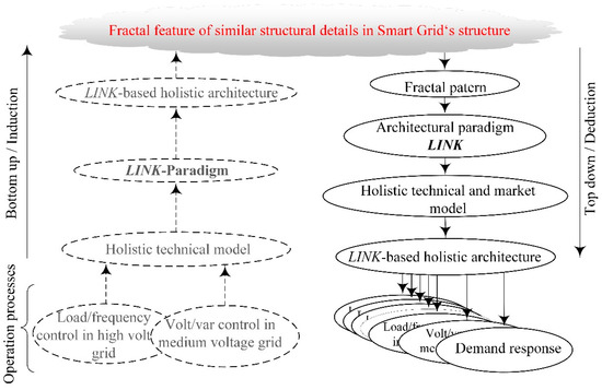 Figure 1 shows the methodology used to design the smart grid architecture. In the first phase a superordinate connection between some well-known operation processes as “volt/var control in medium voltage grids” was established and the holistic technical model was predicted [38]. According to the prediction, the holistic technical model should include the entire power system, i.e., high, medium and low voltage levels and the customer plants. The bottom-up or induction method was initially used to derive the paradigm of smart grids “LINK” and the corresponding holistic architecture. The latter have shown the fractality feature of similar structural details.