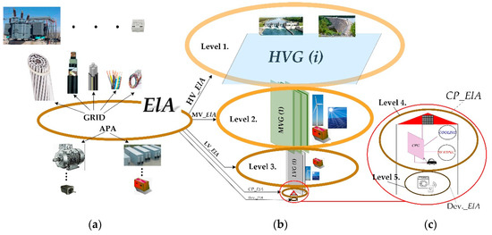 Each ElA-ellipse denotes a separate chain link. It includes the grid of a specific level and all APAs connected to it. Figure 2b illustrates ElA in different levels: HV-ElA, MV-ElA, LV-ElA, CP-ElA and Dev-ElA for levels 1, 2, 3, 4 and 5, respectively. Figure 2c magnifies the CP- and Dev-ElA patterns.