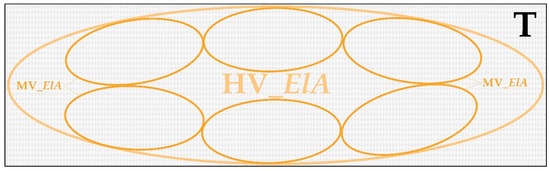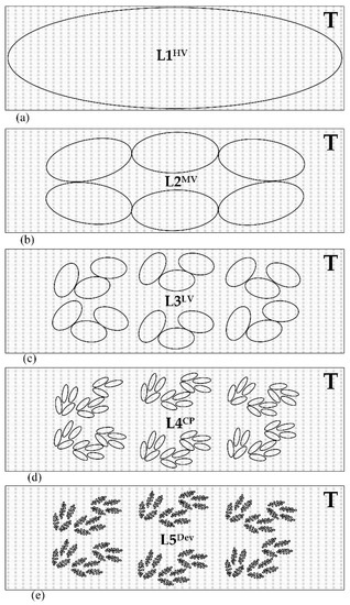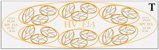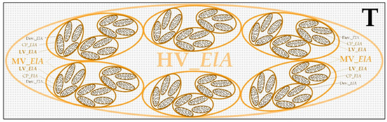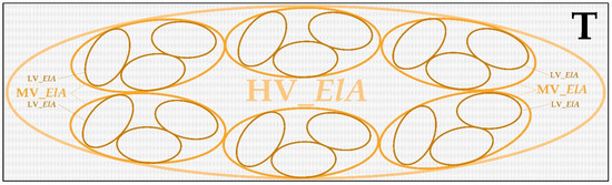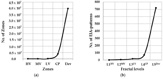 From the bird’s-eye view, all identified fractal levels are in the same territory, T. The overall pattern of level 1, HV-ElA, spreads over the entire T of a country or of a part of it, Figure 3. The patterns of the higher fractal levels propagate in smaller areas of the same territory T, repeating themselves many times. The repeating number of patterns in different fractal levels is derived from the relationship between different zones of power systems in real conditions and the number of appliances comprised in each of them. Table 2 shows a structural overview of the power system in real conditions and of its fractal.