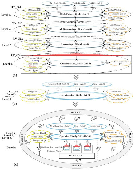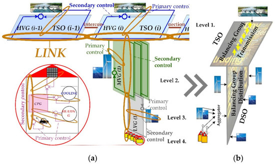 The LINK-paradigm is used as an instrument to design a LINK-based holistic architecture. It facilitates modelling of the entire power system from high to low voltage levels, including CPs and includes the description of all power system operation processes such as load-generation balance, voltage assessment, dynamic security, price and emergency driven demand response, etc. [69]. The LINK-paradigm is the fundament of the holistic, technical and market-related model of smart power systems with large distributed energy resource (DER) shares. Figure 13a shows the technical holistic model (the “energy supply chain net”), which extends to fractal level 4. It illustrates the links’ compositions and their relative position in space, both horizontally and vertically. In the horizontal axis, the interconnected high voltage grids (HVGs) are arranged. They are actually owned and operated by TSOs. The medium and low voltage grids (MVGs and LVGs, respectively) and the customer plant grids (CPGs) are arranged on the vertical axis. MVGs and LVGs are actually owned and operated by the DSOs, while CPGs are operated by customers.