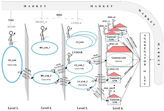 The holistic model associated with the energy market is derived from the technical holistic model, the “energy supply chain net”, as shown in Figure 13b. The whole energy market consists of coupled market areas (balancing groups) at the horizontal and vertical axes. TSOs operate on the horizontal axis of the holistic market model, while DSOs operate on the vertical. Based on this model, not only TSOs but also DSOs will communicate directly with the whole market to ensure a congestion-free distribution grid operation and to take over the task of load-production balance. The owner of the distributed energy resources as well as the prosumers (producers and consumers of electricity) may participate directly in the market or may do so via aggregators or local energy communities (LECs) [71]. The creation of the local retail markets (LRM) attracts the demand response bids and stimulates investment in the LEC areas (see Section 3.3.2).