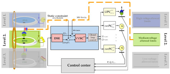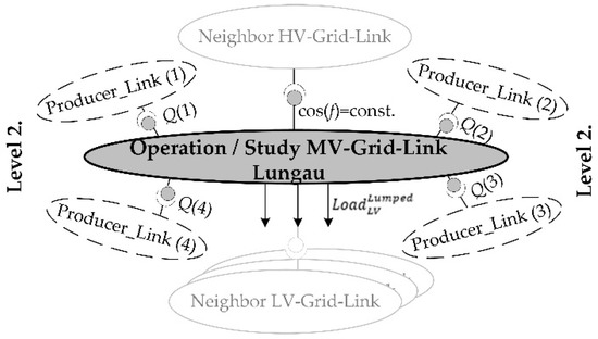 The proof of the concept is performed in the frame of the industrial research project ZUQDE (central volt/var control in presence of DGs), Salzburg, Austria, based on one of the major entities of power systems, the voltage [75,76]. The scope was fractal level 2 (MV), where the secondary control link was realized by means of the volt/var control, Figure 18.