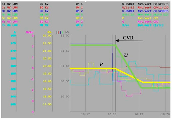 The voltages, power and current during the CVR switching process are shown in Figure 20. The snapshot is made on the SCADA system of the control center. The curves of voltage in one of the 30 kV bus bars and of the active, measured on the supplying transformer level, are highlighted.