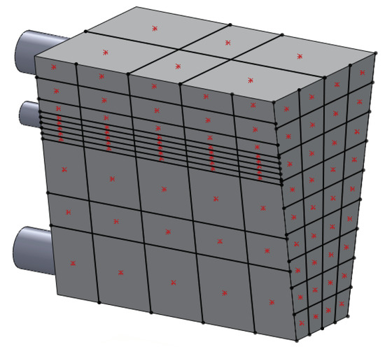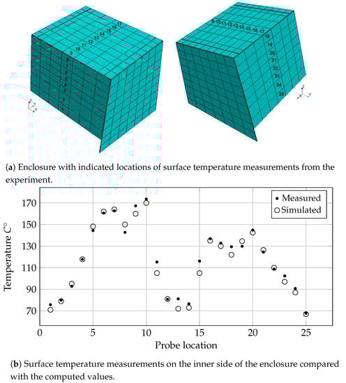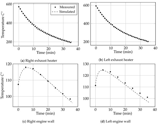 Furthermore, the temperature of the inner side of the glass enclosure along the traverse central section plane (see Figure 7) is strongly affected by the radiation heat from the exhaust manifolds. Due to lack of any measured emissivity coefficients, these parameters are calibrated to achieve optimal correlation between the computed and experimentally measured results for the surface temperature on the inside of the glass enclosure. The iterative calibration procedure used different values for the emissivity coefficients of the exhaust manifolds and engine walls. These coefficients were chosen to achieve optimal predictions of the surface temperatures on the inside of the enclosure in proximity to the exhaust manifolds, as shown in Figure 7b. The obtained values for the emissivity of the exhaust manifolds and engine block are 0.75 and 0.5, respectively, and correspond to documented values of similar materials.