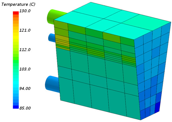 The steady-state heat transfer, confirmed by the stable temperature readings during the initial part of the experiment, was first replicated in a standalone 3D CFD solver without any coupling to the 1D model. The temperature boundary conditions for the engine and the exhaust manifolds, see Figure 6, correspond to experimental measurements obtained from surface-mounted thermocouples with locations previously shown in Figure 3.