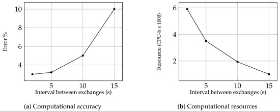 A coupled 1D–3D simulation is carried out to predict the temperature development in the engine solids during the thermal soak and cool-down period after turning off the heating and cooling systems. The coupled simulation is initiated from a fully developed solution of steady-state heat transfer. Given that the resulting heat transfer and averaged fluid temperatures in the boundary cells from the CFD simulations are repeatedly updated in the continuous thermal simulation in the solid domain at certain time interval, it was necessary to first perform sensitivity analysis to determine the effects of this time interval for 1D–3D data exchange on the accuracy of the temperature prediction. For that purpose, the surface temperature was predicted for four different exchange intervals of 2, 5, 10 and 15 s, respectively. The relationship between the accuracy and the exchange interval duration is shown in Figure 8a. It is seen that the percentage difference between the simulated and measured values increases significantly as the time interval decreases from 15 to 5 s. Since a marginal improvement in the accuracy is observed for the exchange intervals shorter than 5 s, accompanied by a notable increase in the computational time (see Figure 8b), it was decided that the data exchange between 1D and 3D computations should take place every 5 s.