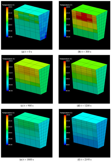 The coupled simulation predicts the temperature development in each thermal mass. The temperature distribution across the surfaces of the engine at six different time instances is presented in Figure 9. The effect of thermal soak on the engine wall surface temperature is evident from Figure 9a,b. Heat dissipated by the exhaust manifolds during the initial 300 s is absorbed by the adjacent engine walls through conductive, convective and radiative heat transfer, resulting in overall increase in the temperature of the engine.