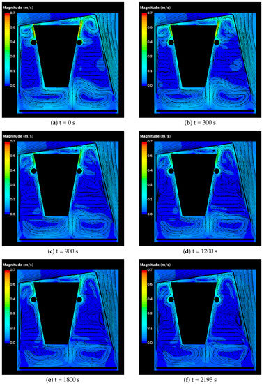 Furthermore, the time history of the velocity and temperature fields in the central section plane is presented, see Figure 10 and Figure 11, respectively. In Figure 10a the most prominent flow structures are two pairs of counter-rotating vortexes, powered by the rising hot plumes above the exhaust manifolds and one more pair of large counter-rotating vortexes in the bottom of the enclosure near the side openings. While their velocity magnitudes decay over time, these flow structures remain present over the entire course of the cool-down period.