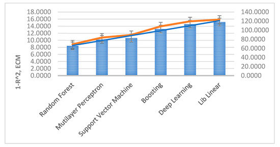 Inside the supervised machine learning techniques, support vector machines (SVM) [45] are properly related to classification and regression problems, representing in a space two classes, maximally separated through a hyperplane with high dimensionality (defined as a vector between two points of each class), that permit the classification of new data in one or both classes. Regarding the application of SVM techniques, the authors [33] present a study on the prediction for cooling of an office building in Guangzhou, China. For this purpose, they use the comparison of different neural network techniques (NNBR, NRBR, NRBR, NRBR) and NSRV, based on the results obtained in each of them from the mean square error and the relative mean (RMSE and MRE). This model of artificial intelligence (SVM) is, in this case, the one that provides the best result, obtaining a high precision in the hourly prediction of the building’s cooling and significantly improving the results of the neural networks.