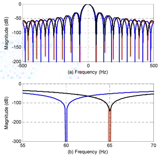 In Figure 4, the cascade connection of NMAFs is applied as the pre-loop filters to block the disturbances before the PLL’s control loop. In this paper, the data window length of the NMAFs is set as , where is the nominal grid cycle.