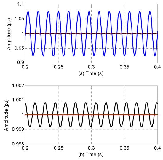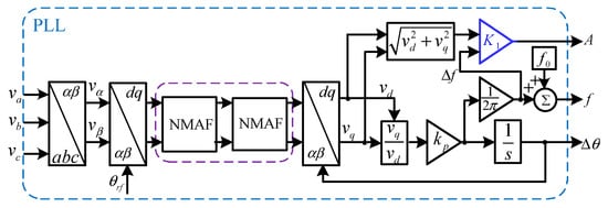 The NMAFs shown in Figure 4 can block the even-order harmonics after the first Park’s transformation. Notice that the first Park’s transformation is equivalent to inversely rotating the voltage signal with the frequency of , thus the even-order harmonics after the first Park’s transformation corresponds to the fundamental frequency negative sequence (FFNS) component and odd-order harmonics in the electrical signal. However, the filtering capabilities of the NMAFs may decrease in the presence of frequency drifts. Moreover, the even-order harmonics in the electrical signal cannot be blocked by the NMAFs. The unsatisfactory filtering capability of NMAFs results in ripples in the PLL’s outputs.
