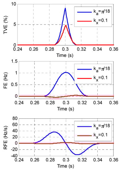 To evaluate the performance of the FA-PSMA under step changes, and are set to 0.1 and individually according to [7]. For the FA-PSMA, the parameters are set as , , , and . The estimated total vector error (TVE) defined in (12), the frequency error (FE) and the ROCOF error (RFE) are shown in Figure 5.