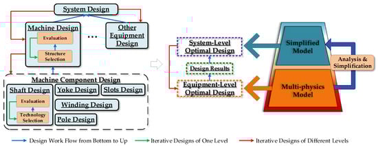 From the perspective of design optimization, design requirements can be translated into design, constraint, and target variables of different levels. Then, the design is conducted hierarchically by algebraic solvers or intelligent algorithms to achieve the best goals with the satisfaction of constraints by well-determined design variables; see Figure 1. As the impacts of variations of variables can be propagated both vertically (from bottom to top, e.g., components, machine, and system) and horizontally (e.g., among components), every design is a combinational optimization problem based on both the underlying design results and the synthesis forms of underlying-level designs, e.g., the selected component technologies and the selected machine structure in the machine design process. Therefore, iterative calculations may occur because of the improper design or integration of the underlying units; in Figure 1, see the red and green-colored directed lines. Therein, the green-colored lines can be avoided by optimization algorithms, whereas the red-colored lines cannot be avoided and may lead to blind designs, due to the invisible and complex cross-links among variables.