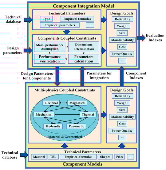 Every component model comprises three parts, namely, technical parameters, multi-physics coupled constraints, and the design goal, in which the multi-physics coupled constraints represent the core linking the other two parts. Technical parameters comprise the design codes from design experiences, standards, and protocols (i.e., densities and strengths of materials, technology readiness level (TRL), etc.), which are used as pre-specified design requirements. According to the selected configurations in the technical parameters, the multi-physics coupled constraints describe the relationship between design variables and performance according to the principle of energy conversion and transmission; structure parameters describing the geometry and material information can be then obtained. Based on these two parts, the design goal calculates evaluation indexes depending on design requirements.