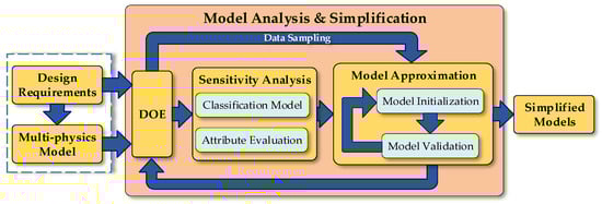 To satisfy the system-level design demands, the MDO method is first used in the simplification of the multi-physics model to generate the simplified model, so that secondary-level models with characteristics of accuracy, simplicity, and consistency can be obtained. This process is illustrated in Figure 3.
