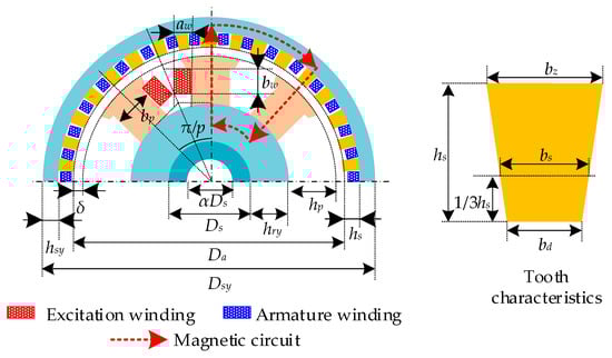 The variable-speed variable-frequency (VSVF) electrically excited synchronous generator is chosen as the case study to illustrate the improved multi-physics modeling process. The 2D structure of the machine is shown in Figure 4. In this study, the weight and power loss are naturally selected as the objectives. According to the proposed method and [29,35], the improved multi-physics model of machines includes the sub-models as discussed in the following.