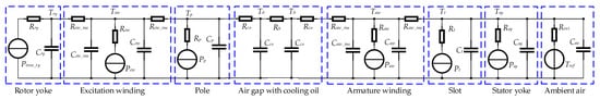The thermal circuit of the yoke satisfies Equation (8). Note that other components have similar thermal models.