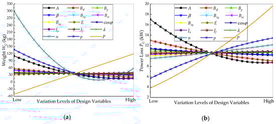 In conclusion, among the undetermined design variables, λ has a relatively large influence on the weight and power loss, but can be ignored with a high-weighted coefficient of power loss considered in the design and evaluation, whereas component operating points (Bp, Bry, Bst, Bsy, Ja, and Jf) can also be reduced due to the optimal design results with few variations. Therefore, the dimensionality reduction is proved conclusive.