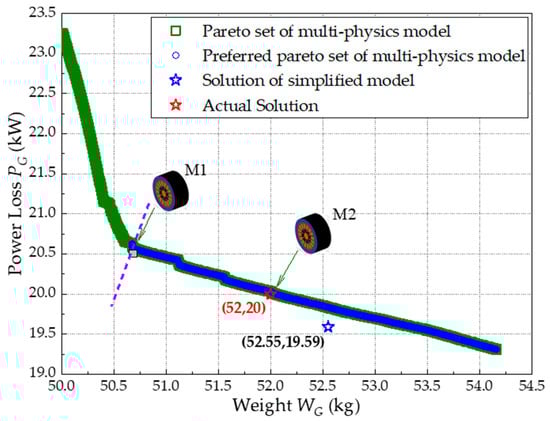 Compared with the actual solution, the errors of the simplified weight and power loss models are acceptably low, at 1.06% and −2.03%, respectively. As the surrogate model is a ‘black-box’ model, the established models are of low complexity. Compared with the weight and power loss of simplified models, the relative variation ranges of the optimal solutions obtained from the multi-physics model on the right of M1 are −3.574–3.067% and −0.526–5.299% respectively, which indicates that the models output almost the same results. In summary, they are proved to be accurate, simple, and consistent.