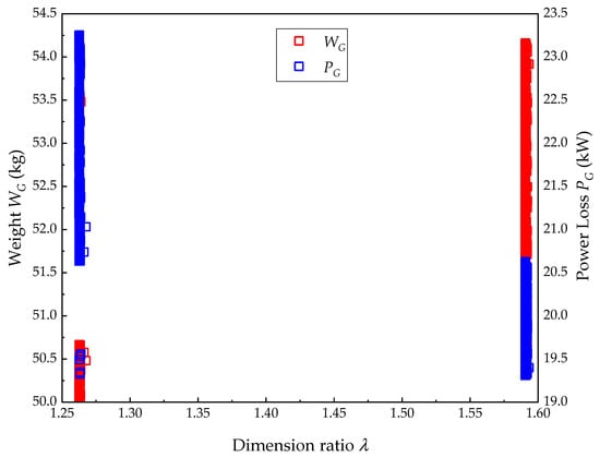 It is noteworthy that the Pareto set can be divided into two parts with the demarcation point M1 by the dimension ratio λ; see Figure 9. Figure 10 demonstrates the data distribution of the dimension ratio λ in the two parts. It can be concluded that a value of the dimension ratio λ exists in the range from 1.263 to 1.267 as the extreme point of the weight model, whereas it exists in the range from 1.591 to 1.593 as the extreme point of the power loss model. The selection of the dimension ratio is determined by the designer, depending on which index is more important. According to the power loss-preferred design, solutions of the 1728 blue-colored circle points in Figure 9 are probably better choices.