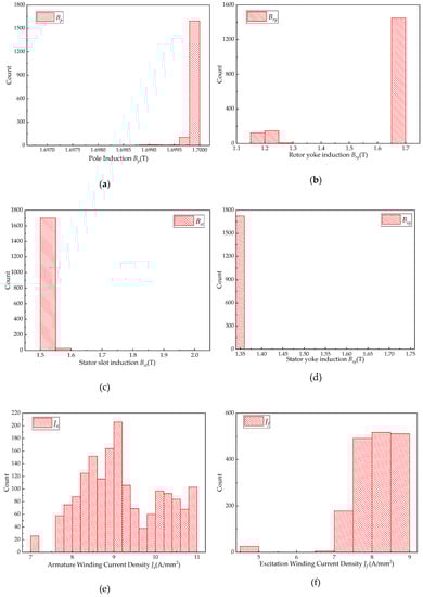 Data distribution of component operating points to be optimized in the preferred Pareto set: (a) pole induction Bp; (b) rotor yoke induction Bry; (c) stator slot induction Bst; (d) slot yoke induction Bsy; (e) armature winding current density Ja; (f) excitation winding current density Jf.