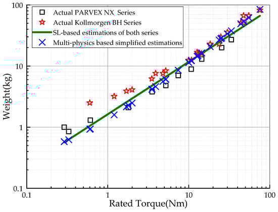 The relationship between the rated torque and weight is demonstrated in Figure 12. It can be concluded that, although the actual weight includes external accessories besides the active mass, e.g., the resolver and cable, both models achieve results with relatively high accuracy.