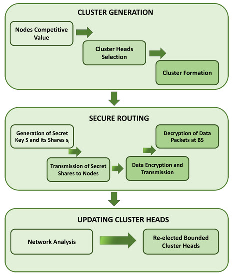 This section summarizes the proposed energy-efficient and secure routing (ESR) protocol for IoT based WSN. The basic structure of a cluster based network is illustrated in Figure 1. The proposed ESR protocol divides the overall its functionality into two main components that are discussed in the next sections. In the first component, ESR protocol organizes optimum hierarchical topology construction and the thresholding based secret sharing scheme (SSS) [45] for secure data routing. Based on multiple criteria along with QoS constraints, the optimized cluster heads are determined in association to the distributed clusters in energy efficient and balanced manner. Furthermore, the proposed clustering scheme improves network lifetime with low overhead and power consumption ratio between the sensor nodes. In the second component, the secure and trustworthy routing path is constructed between cluster heads and BS to avoid any intrusions caused by malicious nodes. To achieve reliable data forwarding, the BS generates a secret key, which is shared among selected cluster heads. In data forwarding from cluster heads, the data packets are encrypted using the SSS mechanism. On the other hand, BS reconstructs the inbound data packets from cluster heads using the proposed secret sharing scheme. Furthermore, the relative impact of each factor in an optimized selection process of the cluster head is evaluated based on a sensitivity analysis, which is a mathematical model that provides an understanding of the affiliation among input and output values in development. Simulation results of ESR outperform other relevant schemes with respect to packet delivery ratio, network lifetime, end-to-end delay, communication cost, number of route discoveries and network overhead. Figure 2 illustrates the block diagram of the ESR protocol.