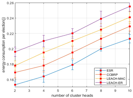 Energy consumption per selection with various numbers of cluster heads under different weighting factors.