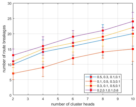 Route breakages with various numbers of cluster heads under different weighting factors.