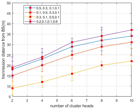 Transmission distance various numbers of cluster heads under different weighting factors.