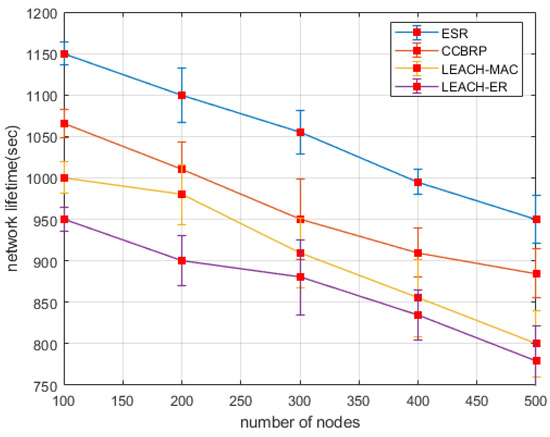 In this section, we evaluated the numerical results of ESR protocol in the comparison of LEACH-ER, LEACH-MAC and CCBRP. The numerical results of ESR protocol were measured with other solutions under different network topologies. The network topologies were varied based on a different number of nodes from 100 to 500. To establish the dynamic network topologies, all the nodes were distributed randomly over the sensor field. The comparison among protocols was performed with respect to network lifetime, average end-to-end delay, packet delivery ratio, average communication cost, network overhead and the frequency of route re-discoveries parameters. Moreover, error bars based on varying standard deviations were used to indicate error or uncertainty in the measurement of experimental results.