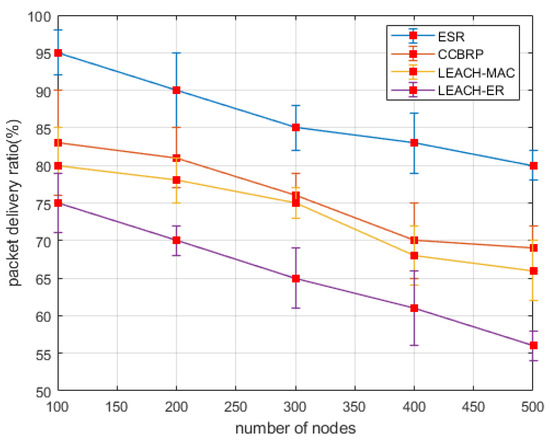 Figure 8 demonstrates the performance measurement in terms of packet delivery ratio for ESR protocol against the existing work under varying nodes density topologies. In Figure 8, ESR has shown the highest data delivery ratio as an average of 30% improvement than existing solutions, especially in high nodes density topologies. This is due to the fact that ESR protocol considering multiple and optimal criteria for the selection of cluster head, and more priority was given to the more suitable nodes for generating stable and energy efficient clusters. In addition, after the formation of clusters, they remained fixed and ESR re-initiated inbound process for the selection of cluster heads. Moreover, the reliability of the data packets that were communicated between the base station (BS) and cluster head was achieved using the threshold-based Shamir secret sharing scheme, which results in reducing route breakages and ultimately increased data delivery performance.