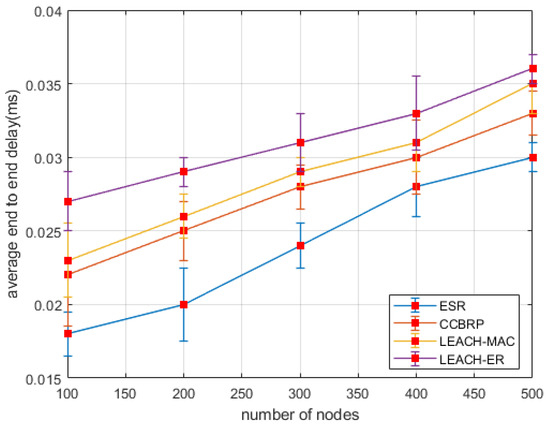 Under varying nodes density topologies in Figure 9, the performance of ESR protocol was evaluated against other solutions with respect to average end-to-end delay. In fact, due to high data traffic, congestion and an increasing number of malicious nodes, the value of end-to-end delay also increased. However, it was seen that the proposed ESR protocol had a lower end-to-end delay in the comparison of other solutions, particularly in large sized and high network load. The numerical results illustrated that ESR protocol achieved a 24% average decrease of end-to-end delay in the comparison of other solutions. Actually, the proposed ESR protocol formed the clusters in an adaptive manner and updates the status of cluster heads within a particular boundary of a cluster. In addition, ESR protocol gave more consistent and robust data forwarding nodes based on a link quality RSSI values that led to routing performance. Unlike other existing solutions, ESR protocol performed the measurement of network analysis to revolve the position of cluster heads in the sensor field, which reduced the chances of routing hole and minimized the data latency ratio.