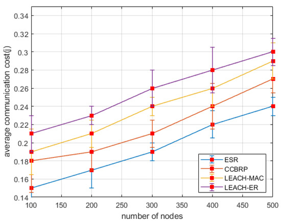 Figure 10 illustrates the comparison of ESR protocol with other protocols in terms of average communication cost under varying nodes density topologies and in the presence of malicious nodes. Remarkably, with a varied number of nodes and malicious nodes, a network led to traffic jamming and network disconnections, which resulted in increases in communication cost and transmission interruption. However, based on Figure 9, it is seen that ESR protocol reduced the communication cost in the comparison of other schemes especially when network load increased. ESR protocol had achieved an average of 29% reduction in communication cost under varying nodes topologies. This was due to making use of neighbor’s information, and in the selection process of cluster heads only a limited number of nodes contributed. Moreover, the re-election for cluster heads was re-called based on the demand and network analysis. Furthermore, support of data security and reliability, ESR protocol decreased the number of route re-transmissions, which resulted in shortening the communication cost.