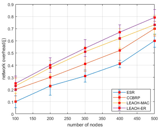 In Figure 11, the comparison of ESR protocol is illustrated against the existing solution under varying nodes density topologies. The numerical results demonstrated that ESR protocol had attained an average of 28% reduction in network overhead than the existing solutions because ESR protocol provided a light-weight secret sharing scheme between cluster heads and BS, which was not only computationally secure to handle the intrusions against malicious nodes but also extensible in terms of varying network topologies. In addition, trustworthy routing paths led to a fewer number of route re-construction messages in the sensor field and thus reduced network overhead. Furthermore, the wireless channels were less congested, as ESR protocol minimized re-election packets because of bounded clustering.