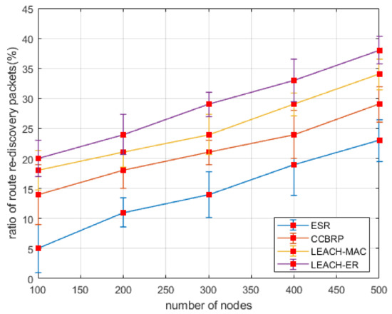 Figure 12 illustrates the comparison of ESR protocol with other protocols in terms of a ratio of route re-discoveries under different nodes density topologies. It is observed that in the presence of malicious nodes, a network incurred a high number of packets for route discoveries and re-transmissionnns. Nevertheless, based on Figure 12, it is seen that ESR protocol decreased the packets of route re-discoveries in the evaluation of other solutions specifically when the network size increased. ESR protocol had attained an average of 38% reduction in the number of packets for route re-discoveries under the scenario of different nodes density topologies. The reason behind this was that ESR measured the network congestion over the elected cluster heads and based on network conditions ESR updated the routing flags of cluster heads. Accordingly, ESR protocol re-adjusted the routing paths from normal nodes to their associated cluster head by flooding the route discoveries packets within a precise region rather than the entire network field.