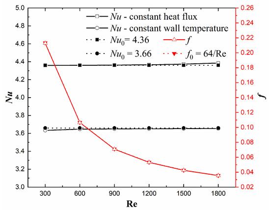 It is necessary to verify the simulation results accuracy before results discussion. The verification method is to compare the numerical results with the corresponding theoretical values in the fully developed laminar flow. In this paper, Nusselt number and friction factor are selected as verification indicators. The working fluid is chosen as water, and the numerical results are taken from the fully developed region of a 20 mm diameter circular tube. The theoretical Nusselt number and friction factor are given in Reference [45]. As is depicted in Figure 6, the computational results agree well with the theoretical formulas. It demonstrates that the present computational solution is accurate enough.