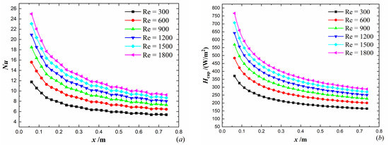 In addition, referring to the definition of Stanton number, this paper proposes a new parameter named heat convection intensity factor that measures the ratio of the mean heat convection intensity to the heat capacity of the fluid. As is known, the heat capacity of the fluid is given as , where is the mean inlet velocity that is also used to calculate the Reynolds number. Thus, the expression of heat convection intensity factor (HCIF) can be written as