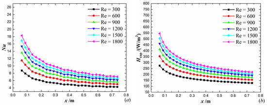 Similar to the analysis in the duct flow, it is known from Equation (38) that the increase of heat convection velocity is conducive to the heat transfer enhancement.