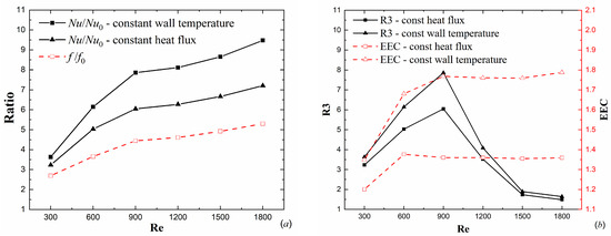 Thermal hydraulic performance with different boundary condition: (a) The enhanced ratios and ; (b) The evaluation criteria R3 and EEC.