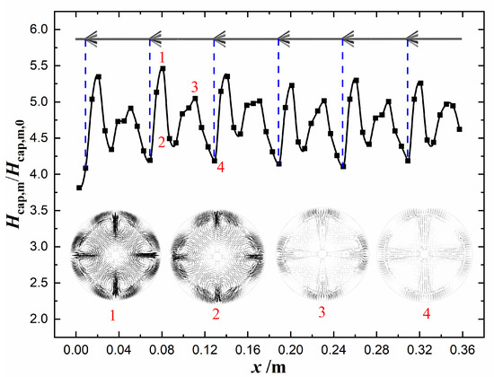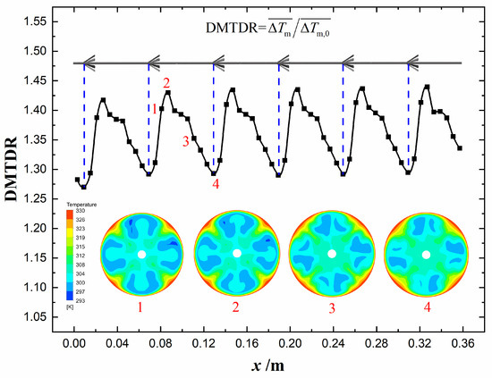 As is shown in Equation (59), there are two aspects for enhancing the Nusselt number. One is to increase the mean heat convection intensity, the other is to form suitable temperature distribution so as to increase the dimensionless mean temperature difference. The enhanced ratios of , , and at Re = 600 are depicted in Figure 13, Figure 14, and Figure 15, respectively. Water is selected as the working fluid, and the constant wall temperature thermal boundary condition is specified at the tube wall. As is shown, the mean heat convection intensity is enhanced much more than the dimensionless mean temperature difference, which indicates that the improvement of Nusselt number is mainly due to the enhancement of the mean heat convection intensity. Besides, the tangential velocity distributions at four cross sections are displayed in Figure 14. It indicates that the longitudinal swirl flow is generated in the circular tube, which leads to the increase of heat convection intensity. In addition, the temperature distributions at the corresponding cross sections are displayed in Figure 15. It indicates that the interphase arrangement of hot and cold fluids is conducive to the enhancement of dimensionless mean temperature difference.