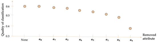 The influence of the attributes on the quality of classification was studied to identify the attributes that mostly affect the classification. This was conducted through a trial-and-error procedure by eliminating one attribute at a time. The quality of classification is presented in Figure 1 by accounting for the effect of the reduction of one attribute at a time on the rough sets analysis.