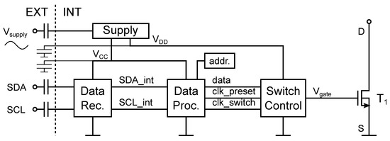 The block diagram of SOMBRA is shown in Figure 2. The isolation capacitors are external. Inside we have a block that controls the supply voltage, a Data Recovery block, a Data Processing block, a Switch Control block, and of course the large switch itself (). is the large N(D)MOS that will conduct the total panel currently. The bulk is connected to the source (S), resulting in a parasitic parallel p-n junction from source to drain (D). This is not an issue in this implementation, as the switch only needs to block current in the direction from drain to source. (Section 2.2.4 also provides an implementation if this were not the case). The source connection will also act as the reference voltage for the entire chip. Activating and deactivating the switch is then as easy as providing a high and low voltage at the gate of ().