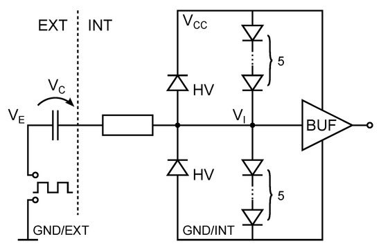 Every SOMBRA chip in the panel has its own reference voltage, but is receiving data from the same central unit with a reference voltage that can be a lot lower (e.g., 10 V). To ensure that DataProc receives CMOS compatible logic levels, isolating capacitors (1 nF) are placed at the inputs, followed by a data recovery circuit (DataRec, see Figure 3). The diodes keep the internal signal () clamped between the supply voltage () and ground. The HV diodes adjust for the difference in internal and external reference voltage (see below), the series of regular diodes filter out any excessive voltages peaks. The subsequent buffer further cleans up the digital signal.