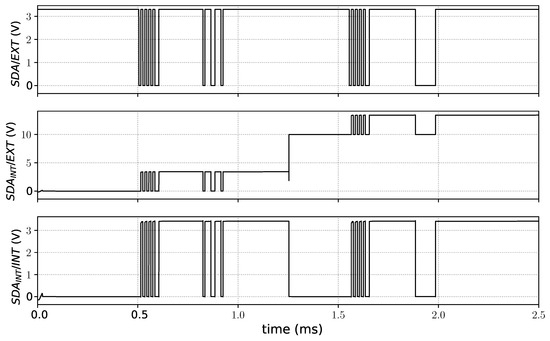 There is one thing that should be taken into account, though. For the data to be received correctly, the voltage over the capacitor, , should be equal to the potential difference between the two reference voltages (). Only then will both a rising edge and a falling edge on the external signal, , be translated into a rising edge and a falling edge on the internal signal, . Let’s elaborate with a small example, assuming V and V. Due to a change in panel configuration, the internal reference voltage, GND/INT, rises to 10 V. The HV clamping diode holds at GND/INT (diode threshold not taken into account). At this point, V. As is still at GND/INT, a falling edge on will not result in a falling edge on . As the start of a new data stream in the IC protocol is indicated by a falling edge, this would result in a missed data sequence. However, a low signal on now changes to equal GND/INT-GND/EXT: a next rising edge on is followed by and a subsequent falling edge on is again translated correctly. Analogous reasoning can be applied when GND/INT suddenly drops in voltage. So before actually starting the data stream, needs to be calibrated. This can be done by sending the data sequence [10101010]. This should happen every time there is a change in panel configuration. It is clear that the internal reference voltage (and thus the panel configuration) should not change when data is being received. Therefore the option is introduced to first send all data to all the switches before changing the states of the switches simultaneously. Figure 4 shows the simulation results of DatRec using the SDA line of the IC protocol. The external signal can be seen on top. At ms, the internal reference voltage jumps to 10 V. The middle signal shows the internal SDA signal with respect to the external reference voltage. The bottom signal shows how SOMBRA sees this internal SDA signal. The bitrate is 100 kbps.